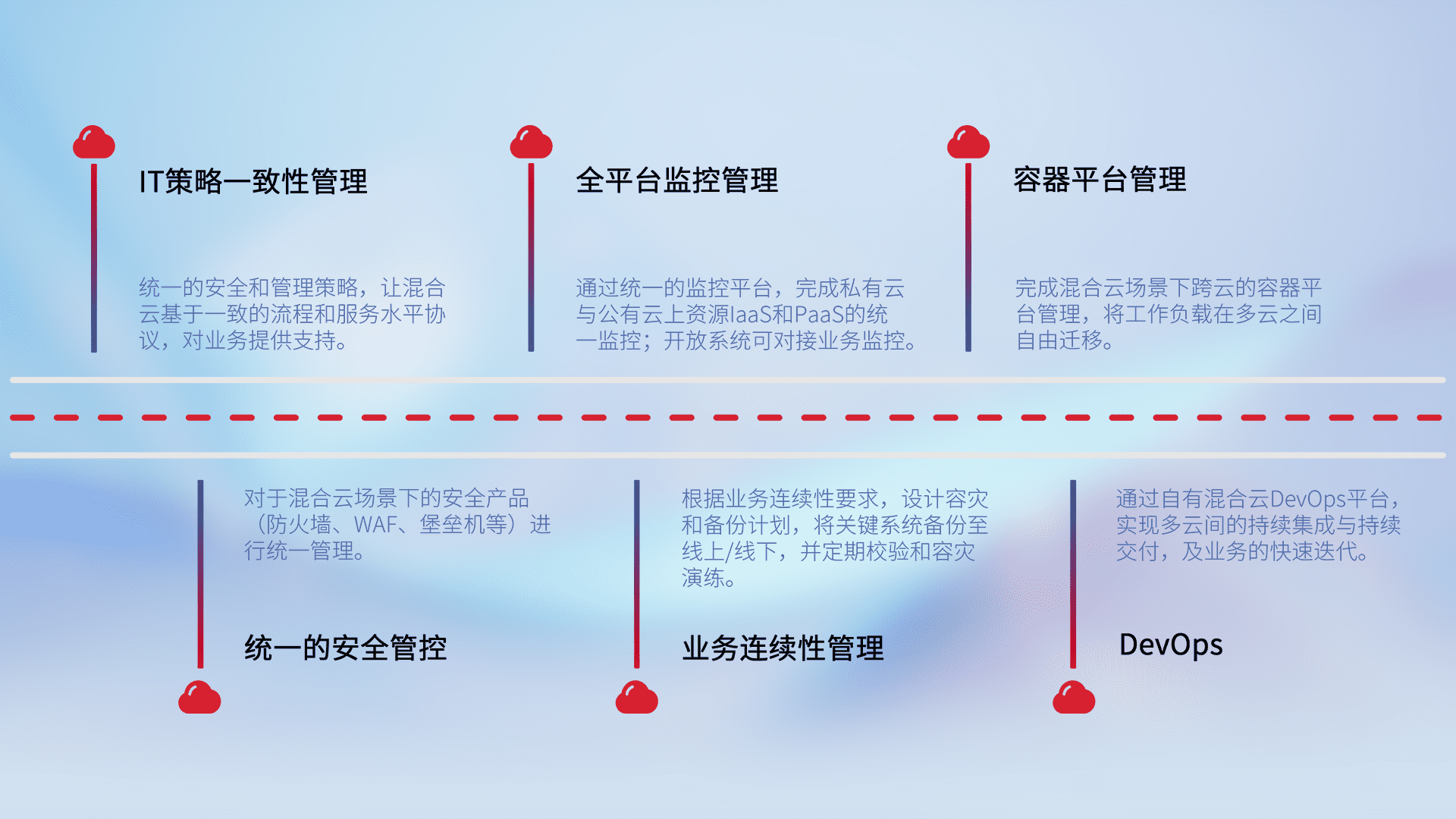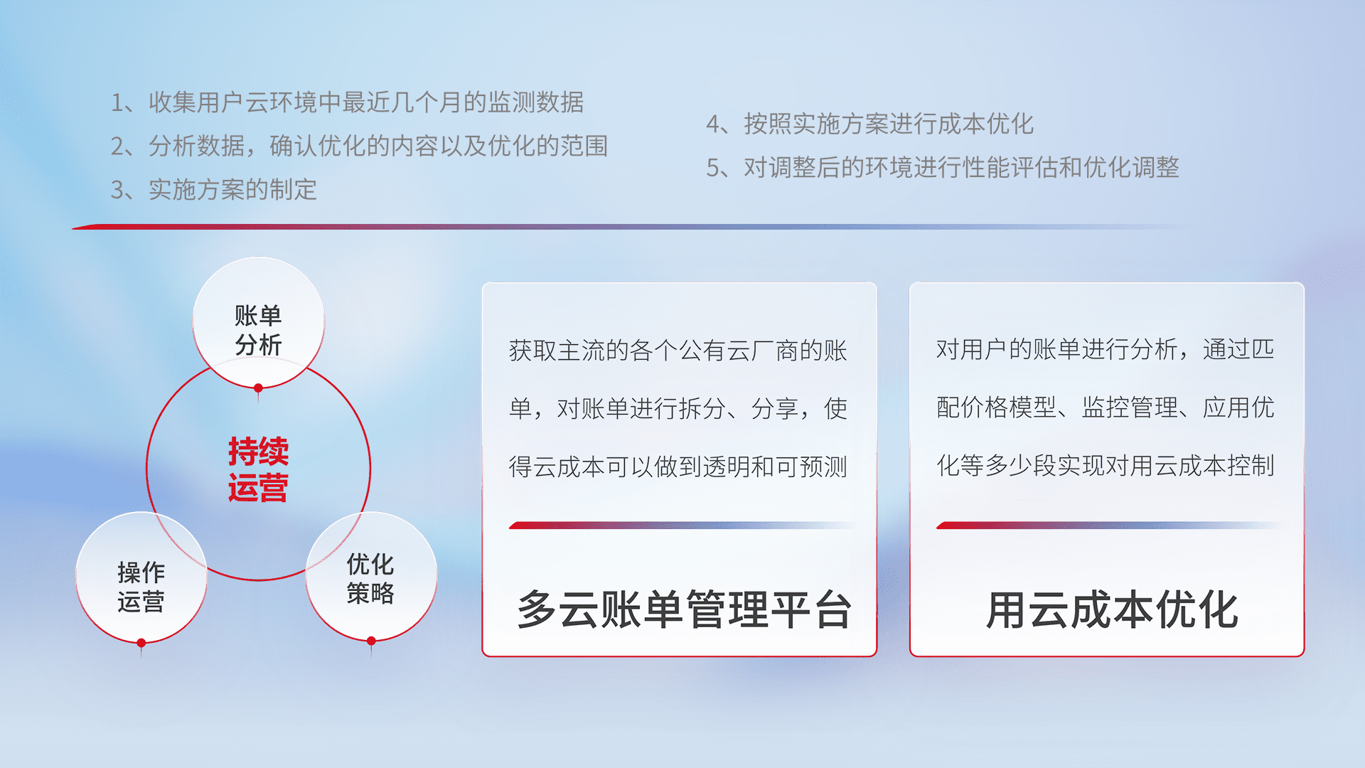 通过多云纳管,,,以统一的资源数据模型把客户的云资源进行抽象和封装,,进而实现对多云资源的统一操作,,,,保障云资源管理的可靠性、、、稳定性与可用性。。。。量身定制化运维内容,,,配置、、、、开发运维、、、、补丁管理、、、、备份、、、、监控、、认证和访问管理、、、、审计和日常巡检等,,,保障在用云过程中的可靠度,,,稳定度以及高可用率。。。。