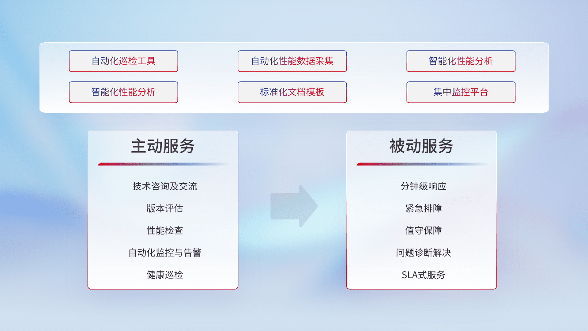 智能化工具和标准化文档,,保障服务质量,,,提供主动服务(包含技术咨询、、版本评估、、、、性能检查、、自动化监控与告警、、、、健康巡检)和被动服务包含(分钟级响应、、、紧急排障、、、、值守保障、、、问题诊断解决、、、SLA服务)。。。